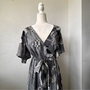 Anthropologie Wrap Dress Black White Abstract Swing Skirt Short Sleeves SZ 6 NEW