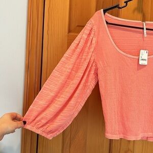 Free People NWT Day Lily Smocked Blouse in Coral with Classic Puff Sleeve Silhouette with Rounded Neckline and Lightly Smocked Fabrication