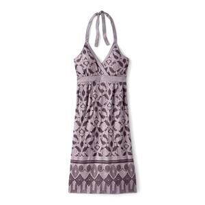 The perfect summer staple! This soft knit halter dress from Athleta features a flattering empire waist with a tie-back detail and a gorgeous burnout pattern in shades of purple. Ideal as a lightweight sundress or a stylish swimsuit cover-up for vacation, travel, or lounging.
