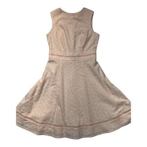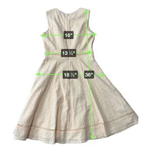 A charming Calvin Klein dress featuring a delicate eyelet design. The sleeveless silhouette and fit-and-flare shape create a flattering and feminine look. This dress is detailed with scalloped lace trim at the waist and hem, adding a touch of elegance. Perfect for a garden party, bridal shower, or a sophisticated brunch.