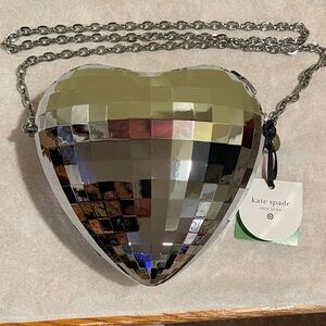 Chic heart-shaped bag with a metallic mosaic pattern. New. Features a sleek detachable chain strap. Strap drop 23". Can be used as a clutch/crossbody or shoulder bag. Ideal for a standout accessory. Flawless pink lining. Kiss lock magnetic closure. Great for romantic or special occasions. Minor discoloration to upper right area as noted in photo. See all photos. Price reflects same. Ready to ship. Happy Poshing ๐