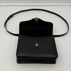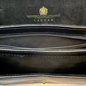 The black Launer Royale crossbody bag is in good condition. The strap has been replaced with a brand new never used aftermarket crossbody strap. Has a very impressive high quality suede interior. Retails new for $4,180 USD. The only handbag brand carried by the late Queen. Made in England by skilled artisans since 1941.