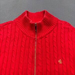 A red cable knit sweater from Lauren Ralph Lauren. Features a full zip front and a mock neck design. The classic cable knit pattern adds texture and dimension, while the gold-toned zipper and pocket zippers offer a touch of hardware detail.