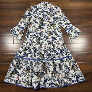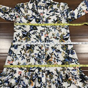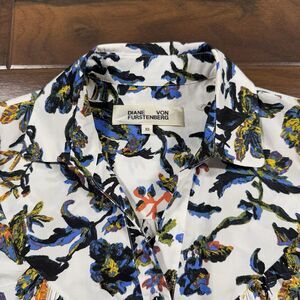 Diane Von Furstenberg Women's Size XS White Floral Barry Gathered Poplin Midi Dress, Button Front, Collared, Pockets, No Stretch, Unlined, Sheer Ladder Work On Sleeves and Lower Portion
