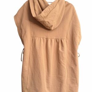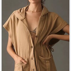 Stay stylish and comfortable with this tan hooded button-up vest. Perfect for layering, it features a relaxed fit and convenient front pockets.
