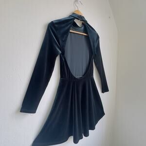American Apparel velvet skater dress in “Blue Nile” (emerald green). High collared neck, long sleeves, backless style, and full skirt. Classic Y2K party/festive look.