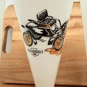 This set of 4 white painted Pilsner glasses features a vintage design with a Buick, Oldsmobile, Cadillac, and Rambler theme, perfect for collectors of breweriana and vintage US beer glasses. The glasses showcase unique and nostalgic branding, making them a standout addition to any drinkware or collectibles collection. Ideal for showcasing your love for classic American automotive brands while enjoying your favorite beers. Each glass is about 7.5 inches tall.