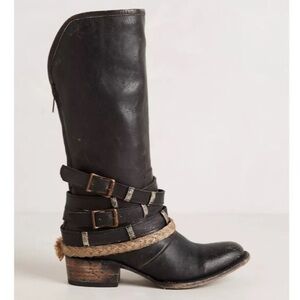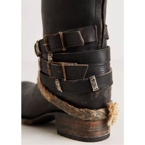 These distressed leather Drove Boots from Freebird by Steven in black distressed leather features a western cowboy silhouette with a back zipper closure, buckled harness straps around the ankle with hammered silver tone details and a braided jute strap. Low stacked heel. Leather upper, lining, and sole. Made in Mexico.
