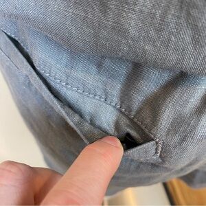 Perfect outfit for the summer! Lightweight 100% linen romper in a dark blue-gray has a functional button front and tie neck. Romper is sleeveless, has an adjustable drawstring at waist and lots of pockets. Two rear welt pockets and two large patch pockets on front. Comfort and functionality make this a go-to outfit for summer fun.