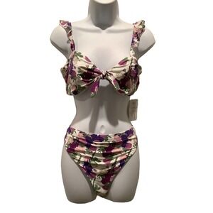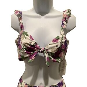 DIPPIN’ DAISY’S Recycled nylon sustainable swimwear bikini. Size L. New With Tags. Pretty floral print has a retro vibe. Fully lined. Countess top has small ruffled straps. The Ultra bottom has a sleek high waist fit. Cheeky moderate coverage-High leg cut.