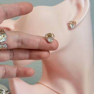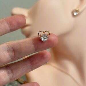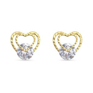Elegant gold heart stud earrings with sparkling stones. Perfect for adding a touch of glamour to any outfit.