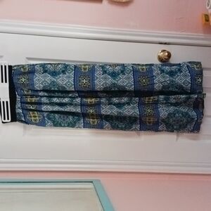 3" BLACK CROCHETED ELASTIC WAISTBAND PANTS, 100" RAYON IN MULTICOLORED BLUES AND GREENS. INSEAM 31", WIDTH AT HEM 12" FLAT, WAIST 11" UNSTRETCHED, APPROX THIGH 13" FLAT, SIDE POCKETS