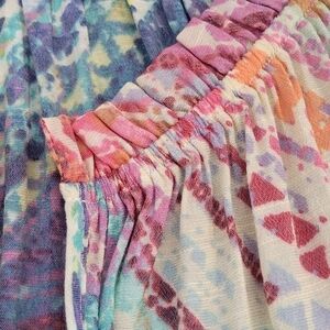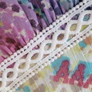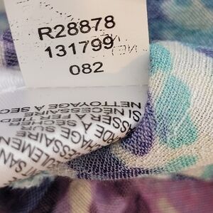 This multi-colored peasant tunic blouse by Spense has a ruffled V-neck and 3/4 flare sleeves that elevate the breezy summer style.
