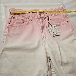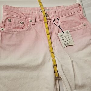 Get ready for sunshine with these vibrant Zara high-rise Bermuda shorts. Featuring a beautiful pink to white ombre gradient and a modern raw hem, these shorts offer a fresh, fashion-forward take on classic denim.