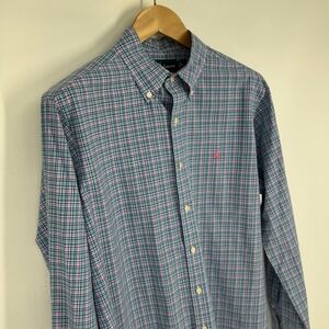 Discover effortless style with this classic Ralph Lauren men's button-down shirt. The timeless plaid pattern in shades of blue, green, and pink offers a versatile look, while the iconic pink pony logo embroidered on the chest. Name written inside collar.