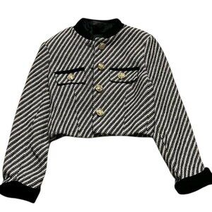 Chic black and white striped cropped jacket featuring gold-tone buttons. Stylish, structured, and perfect for layering or statement outfits.