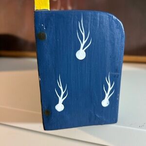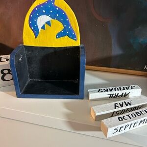 Charming wooden perpetual calendar featuring a playful dolphin design. Showcases vibrant blue, yellow, and white colors.