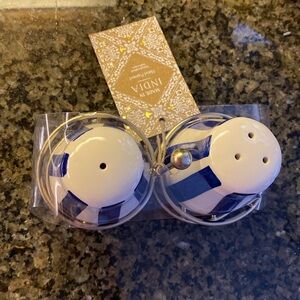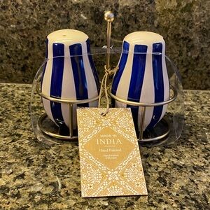 NWT! Hand Painted Blue & White Stripe Ceramic Salt and Pepper Shakers w/ Stand
