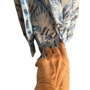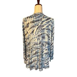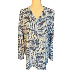 The LOGO Lori Goldstein Blue Sea Cardigan Top is a stylish and versatile addition to any woman's wardrobe. This long sleeve blouse features a V-neckline and button closures, perfect for a casual or travel-friendly outfit. Made from a blend of polyester, spandex, and rayon, this lightweight top is easy to care for with machine washable fabric. The geometric blue pattern adds a touch of interest, making it a great choice for the summer, fall, and spring seasons.
