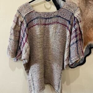 Rebecca Jane Noble Wearable Art Hand Woven Short Sleeve Top Tan Burgundy Blue