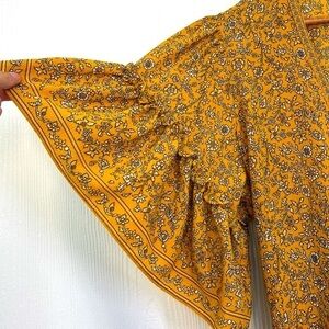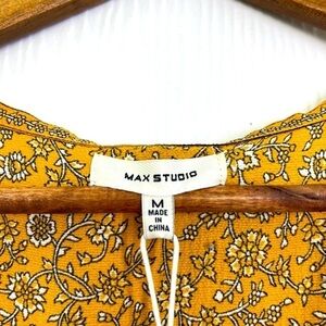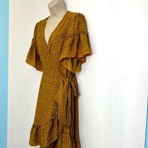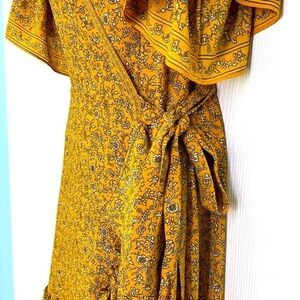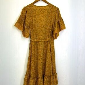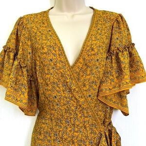 Max Studio - Ruffled Short Sleeve White Floral Yellow Wrap Midi Dress Size Medium