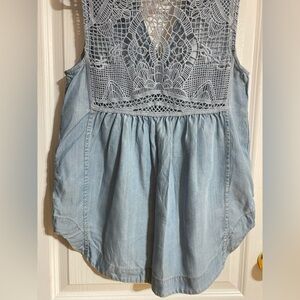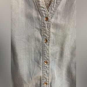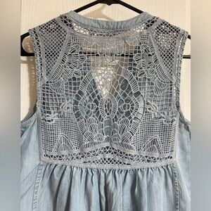Anthropologie Holding Horses Chambray Crochet Buttoned Sleeveless Blue High Low Boho Lace Western Jean Denim Top