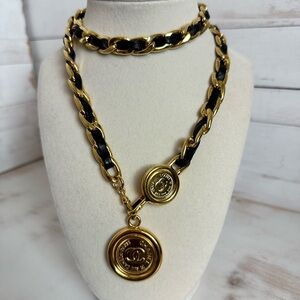 This belt features a leather woven 24k plated gold chain link body intertwined with black leather, a medallion charm, and a hook closure. 94A