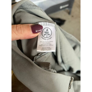 This is a pre-owned Roots Yoga women's Full-zip jacket in a light gray green color, size L. full-length zipper closure with a branded pull tab. It has two zippered pockets on the front. The material tag indicates a blend of 88% nylon/polyamide and 12% spandex. The garment appears to be in good condition with no significant visible imperfections.