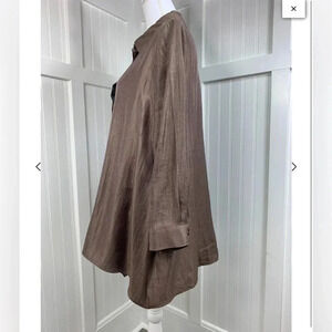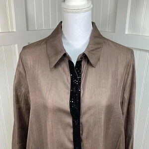 IC by Connie K button front tunic in bronze. Black sequin trim. Front pocket. Long sleeves. Asymmetrical hemline. Bust 22” length 30” Excellent condition. Size M