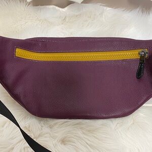 New NWT Rare Authentic. Coach belt bag with bold purple and yellow accents. All zippers and buckle works. Leather front and suede sides.