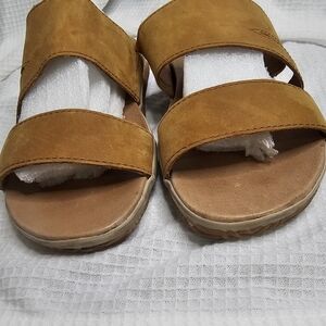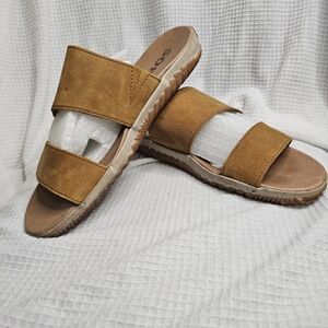Stylish tan slide sandals. Comfortable and versatile. Perfect for casual wear.