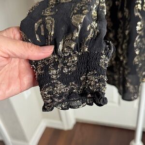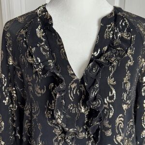 Elegant black blouse with gold patterns. Features ruffled neckline and long sleeves. Ideal for stylish outings.