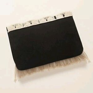 The PERFECT clutch bag with a macrame design and fringe detail. The bag has a snap closure and a fabric lining.