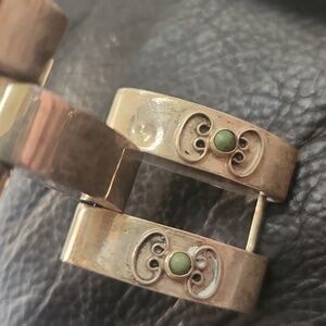 This elegant silver bracelet features intricate designs with green accents, perfect for adding a touch of sophistication to any outfit.