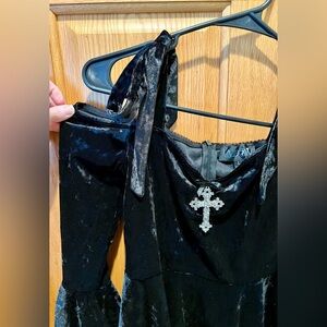 NWT Dolls Kill Widow Nocturnal Elegance Mini Dress in Black Velvet Silver Cross