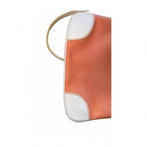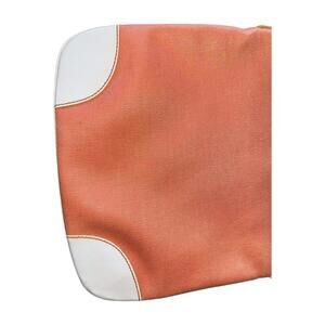 Stylish Burberry crossbody shoulder bag featuring a peach fabric body with white leather accents on the corners and trim.