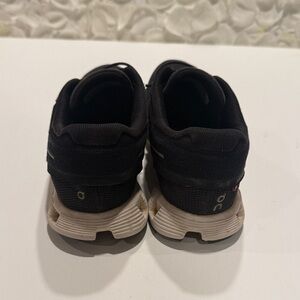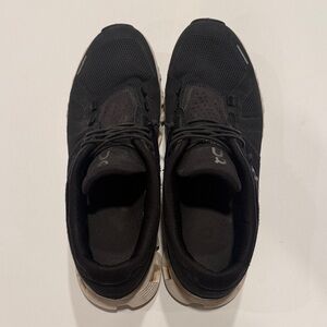 Stylish black sneakers with white detailing. Perfect for running and casual wear. Comfortable and durable design.