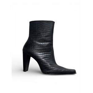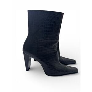 The product is a vintage pair of Nine West women's boots in size 7.5 US (6 UK, 7 AU). These black leather boots feature a pointed toe with an alligator pattern, a knee-high shaft, and a flat heel under 1 inch. The boots are perfect for casual occasions and are part of the 80s-themed collection. Made in Brazil, they have a leather outsole and lining, adding a touch of luxury to the stylish bootie design. A timeless addition to any wardrobe, these boots are a must-have for fashion-forward women looking for a unique and elegant footwear option.