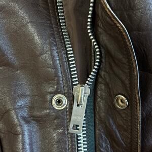 Unbranded mid-1950s brown leather flight-style jacket, likely Japanese-made for export. Features original HDK zipper (a Japanese manufacturer active primarily in the 1950s), mouton collar.