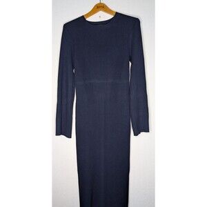 The J Crew women's long blue dress in size medium features a solid pattern with a round neck and long sleeves. Made from viscose knit fabric, this maxi dress has a pullover closure and is perfect for various occasions such as travel, parties, or casual outings. With a length of 36 inches, this classic styled dress is versatile for summer, fall, and spring seasons, making it a stylish choice for any wardrobe. **missing belt, please see photo***
