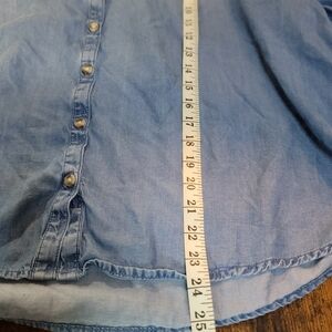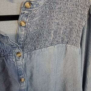 Chic light blue shirt with button-down front. Features smocked detailing and long sleeves. Ideal for casual wear.