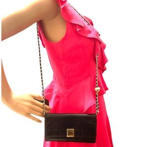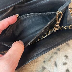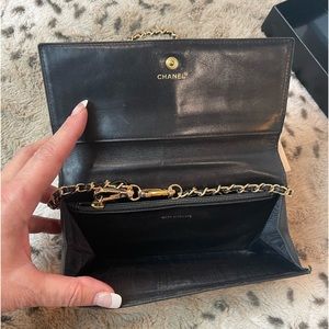 Elegant black quilted wallet. Gold chain and clasp. Iconic CHANEL design.