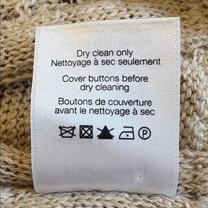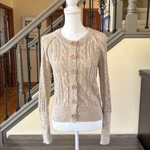Chic cable knit cardigan with wooden button front. Soft texture and elegant design. Ideal for layering. Veronica Beard size small. In good pre owned condition, see last four photos of minor wear.