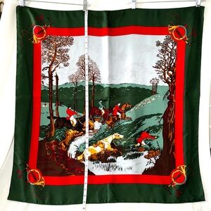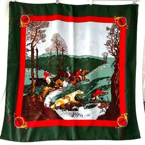 This GINNIE JOHANSEN Vintage 1980’s Equestrian Foxhunting Horseback Riders Scarf is FABULOUS! It is from 1986 and made in Japan. The scene depicts a group of riders out on the Foxhunt and one rider has fallen by a stream. Beautiful vibrant colors! This scarf can be worn myriad ways: Tied around your Neck, as a Headband / Headscarf, Rolled up and worn around your waist as a Belt, or tied on your Bag!