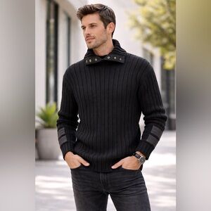 Men’s Black Ribbed Sweater with Snap Collar & Cargo Sleeve Detail – Size Large