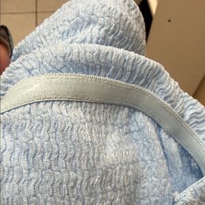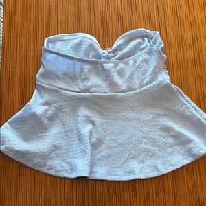 Elevate your style with this chic light blue strapless top. Perfect for any occasion, this top offers a flattering fit and a stylish look. Super cute, pictures of the tie ruched front and of the rubber type strip to keep the top up! Worn once… just not me!