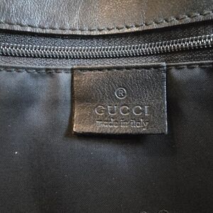Gucci Bamboo handbag in black leather, black lacquered bamboo handle, one exterior pocket, nylon lining, one compartment with zipper, stainless steel hardware. Fold over flap with snap closure. Stamped Gucci made in Italy and date code on inside. Hardware stamped Gucci. Excellent used condition.