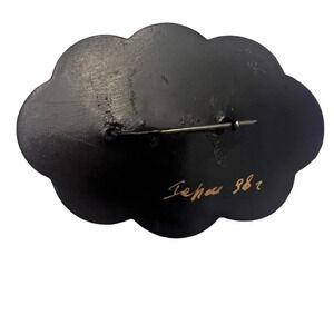 Vintage 60s-70s Hand Painted Floral Wooden Brooch Pin Black Signed