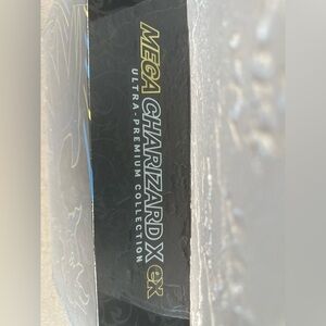 Mega Charizard X collection box. Features bold black and gold accents. Ideal for fans and collectors.
