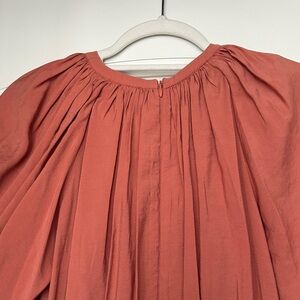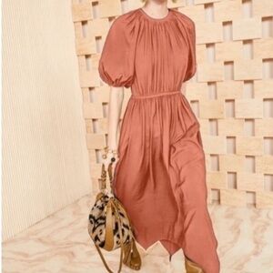 Elegant terracotta midi dress. Features puff sleeves and gathered neckline. Asymmetrical hem adds flair.